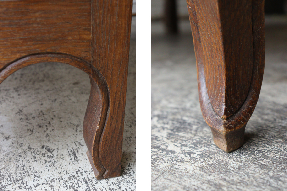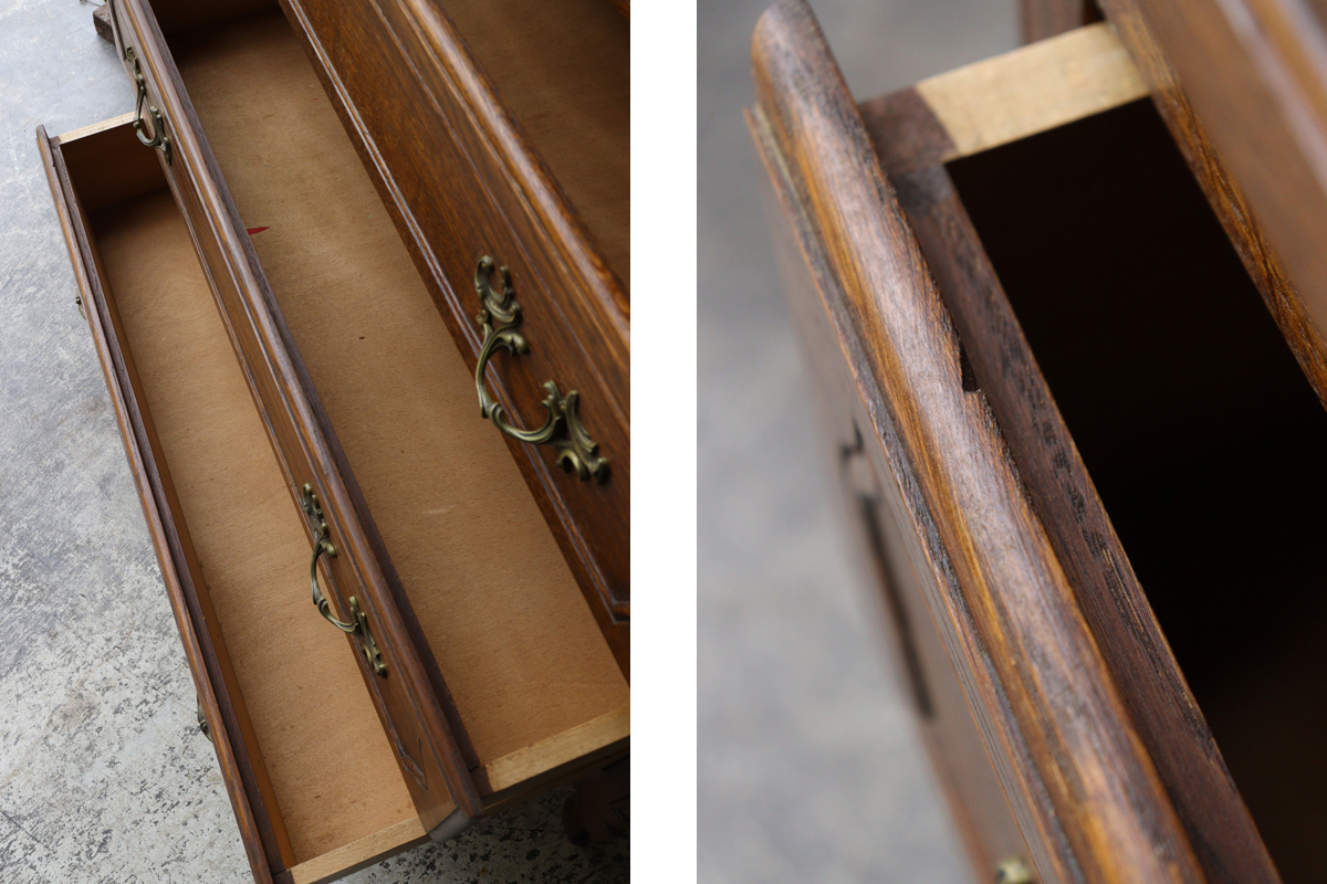 ドロワー部分には小さなカケがみられたり、経年により反りが生じていたりします。またドロワーを閉じた際にチェスト本体とドロワーがぴたっと閉じない場合もございますが、開閉は比較的スムーズでゆっくりドロワーを閉じていただきますとぴたっと閉じます。装飾部分や猫脚部分にも小傷や小さなカケがございます。