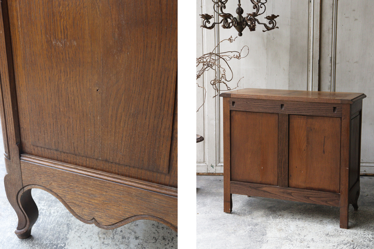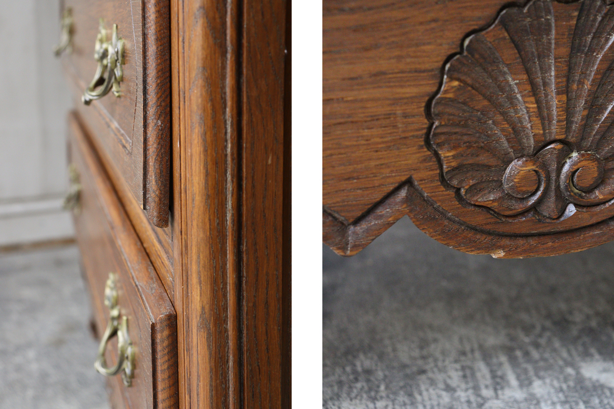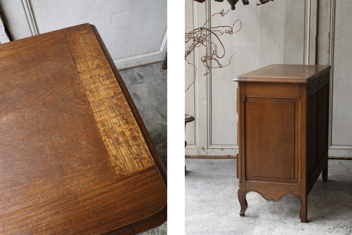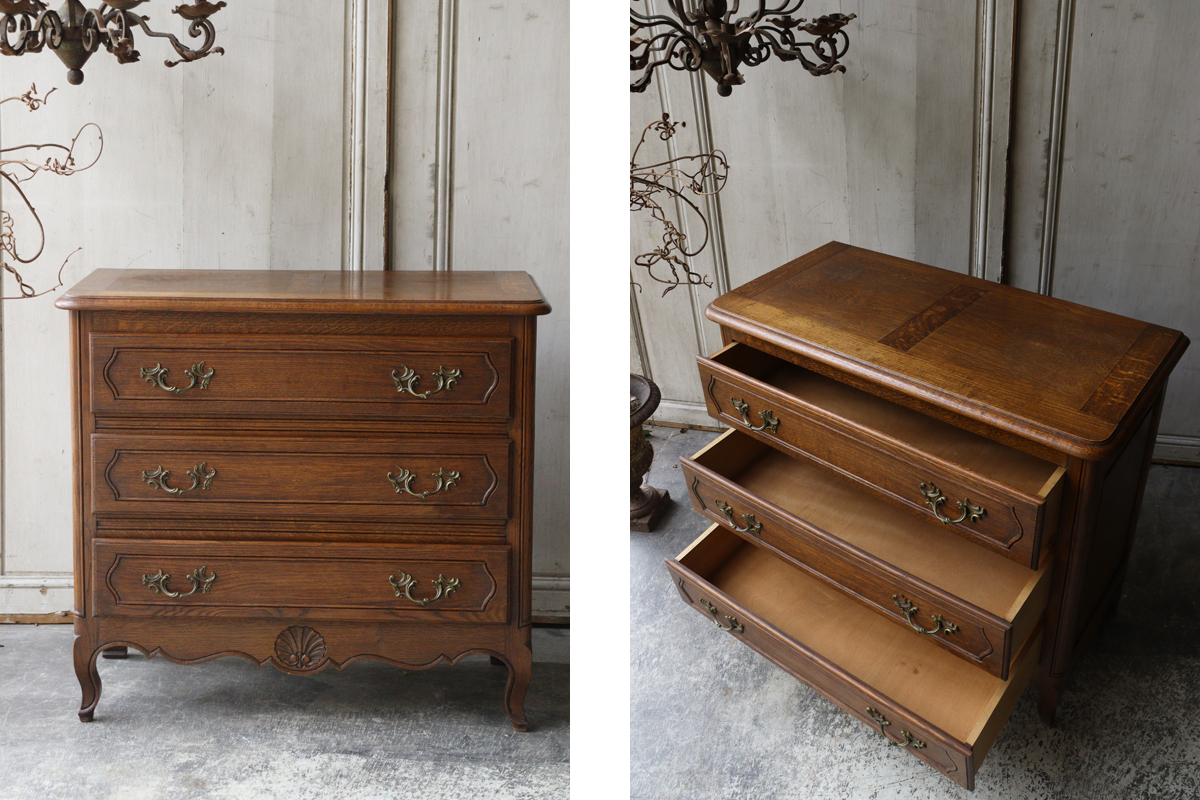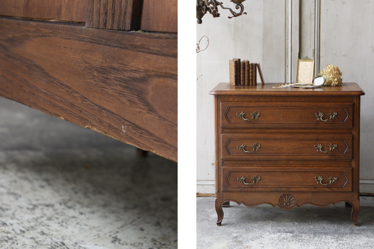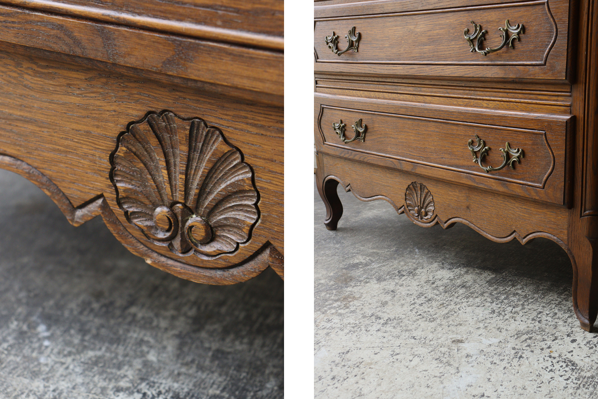 深みあるブラウンの色合いに美しい木目。ドロワーや脚元をあしらう美しい彫刻と優雅な雰囲気を感じさせる猫脚もフランスらしいデザイン。ドロワーには曲線からなるくすんだ持ち手があしらわれチェストを華やかに彩ります。