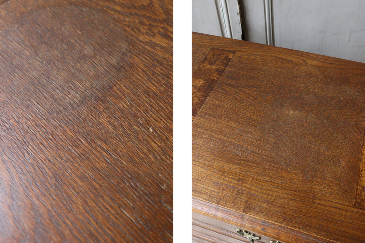 天板は輪染みや小傷、表面の木肌が剥がれている箇所、触れると少しザラつきが見られる箇所や強く色褪せた箇所もございます。